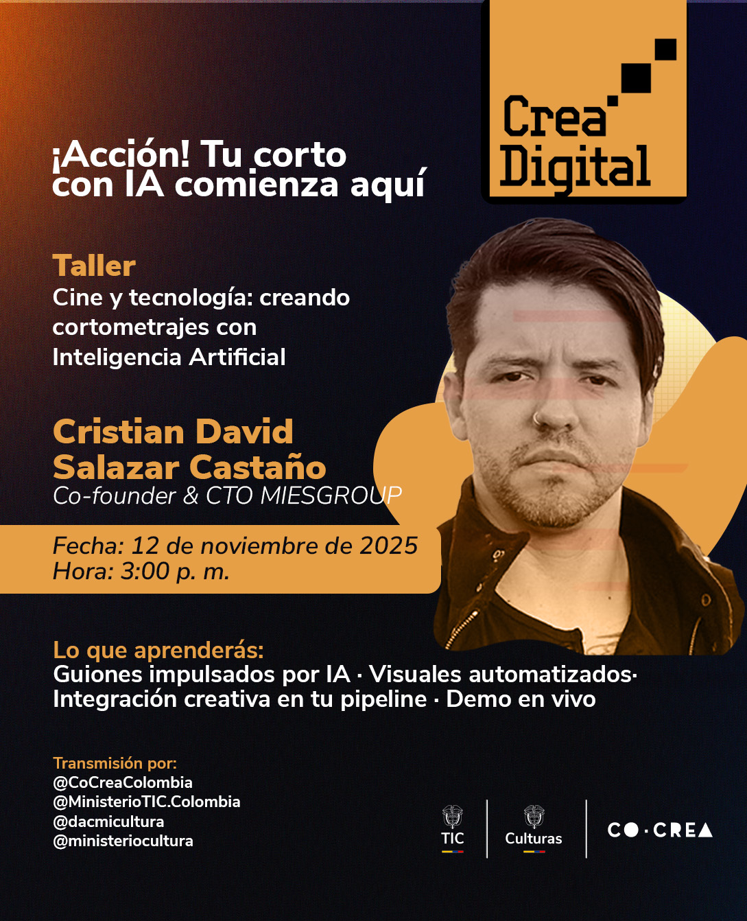 La segunda, enfocada en el fortalecimiento de capacidades, incluye la continuidad de una agenda de eventos formativos en noviembre 2025 con las conferencias De Flash a la IA; Cine y Tecnología: generando cortometrajes con IA; y Marketing y estrategias de promoción con IA.