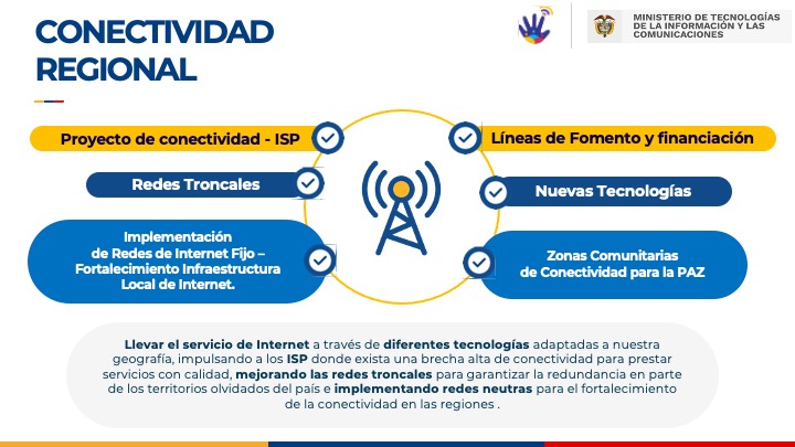 En la diversidad del territorio colombiano existen diferentes alternativas de comunicación, no es lo mismo conectar al Amazonas, a La Guajira, al Pacífico, a la Orinoquía o al Altiplano Cundiboyacense; es por esto que estas comunidades se convierten en aliadas para que ayuden a llegar a más capacidad, llegar a más hogares. La meta, medida en habitantes, es sumar a 32 millones de colombianos y colombianas que tengan acceso a internet.