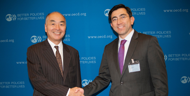 Subsecretario General de la Organización para la Cooperación y el Desarrollo Económico (OCDE), Rintaro Tamaki y el Ministro TIC, Diego Molano Vega, durante la reunión llevada a cabo en París
