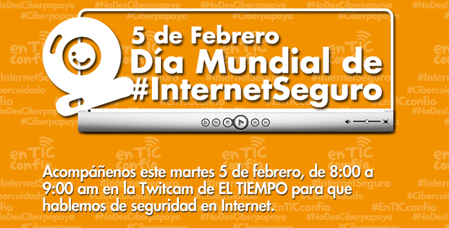 La invitación es a conectarse a través de la Twitcam de El Tiempo, el martes 5 de febrero de 8 a 9 a.m. y a participar con ideas y comentarios a través de Twitter con los hashtag #InternetSeguro y #MeAseguro