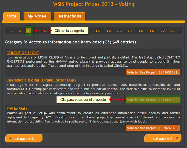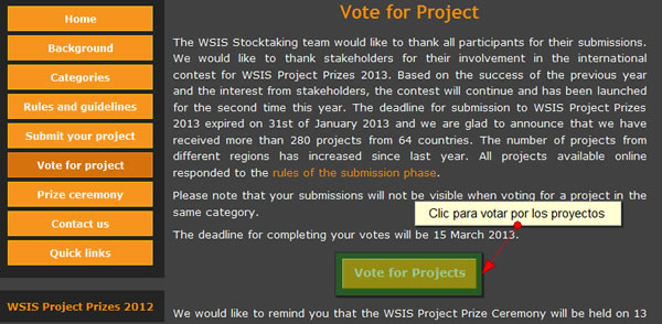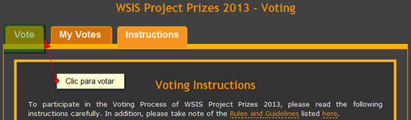 Una vez ingresado a WSIS Project prices 2013, hacer clic sobre VOTE FOR PROJECTS