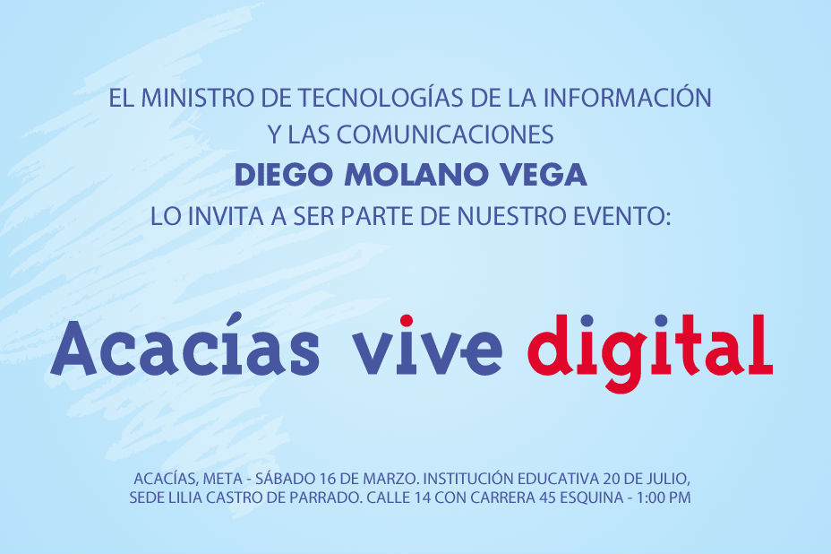 La prensa está cordialmente invitada a cubrir el evento, se dispondrá un transporte que saldrá de la Alcaldía de Villavicencio a la 1 p.m. Confirmar asistencia en el correo churtado@mintic.gov.co