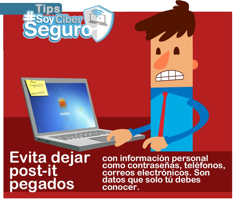 - Evita dejar post-it pegados con información personal como contraseñas, teléfonos o correos electrónicos, es información que solo tú debes conocer.