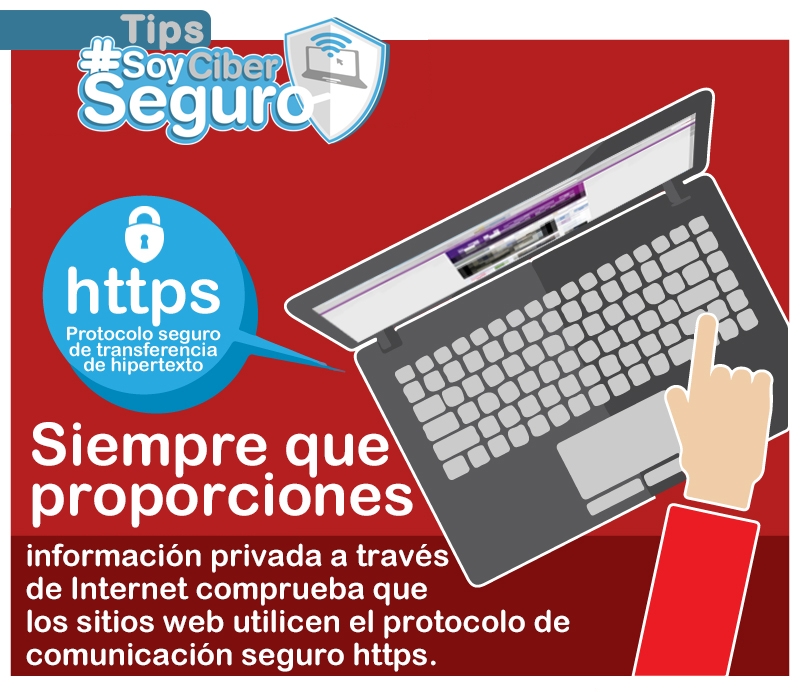 - Siempre que proporciones información privada a través de Internet como nombre, apellidos, datos de tarjeta de crédito, etc., comprueba que la página envía la información utilizando el protocolo de comunicación seguro HTTPS.