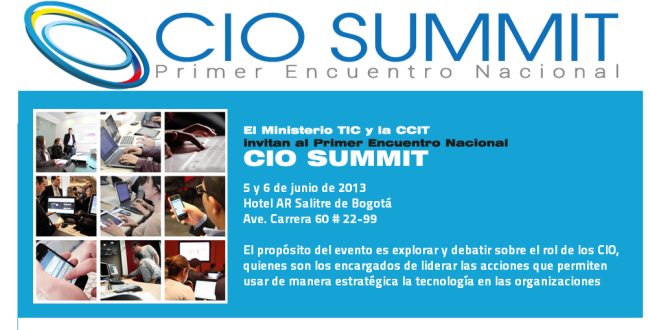 El Ministerio TIC y la CCIT organizan el primer encuentro nacional de CIO, que se llevará a cabo en el Hotel AR de Bogotá el 5 y 6 de junio de 2013. El evento reúne a los directores de tecnologías del sector público colombiano de todas las regiones, líderes de la industria TIC y dirigentes de las diferentes carteras del Estado.