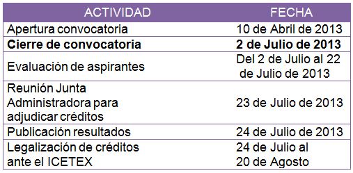 La fecha de cierre se aplazó para al próximo 2 de julio de 2013, te invitamos a inscribirte en esta convocatoria lo antes posible. Esta convocatoria busca incentivar la formación en programas técnicos y tecnológicos, en áreas del conocimiento de las tecnologías de información (TI) específicamente en temas relacionados con desarrollo de software y aplicaciones informáticas, gestión de proyectos de TI, control y aseguramiento de calidad en TI, arquitecturas y seguridad en TI, en mercadeo, venta consultiva, comercialización y gestión de ventas en TI.