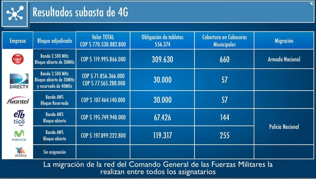Adicional a esta suma de dinero los operadores tendrán que destinar recursos para cumplir con obligaciones de cobertura a las cabeceras municipales más alejadas, planes especiales y compra de 556.374 tabletas para los estudiantes más pobres, como parte del pago por el espectro. El operador dominante tiene que cumplir con las obligaciones más altas.