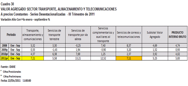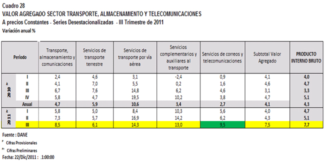 Para el tercer trimestre de 2011, también el sector correspondiente a Transporte, almacenamiento y comunicaciones presentó una variación porcentual anual del 8.5% con relación al mismo periodo del año anterior. Dentro de este sector se encuentran las actividades relacionadas con servicios de transporte terrestre y por vía aérea, servicios complementarios y auxiliares de transporte y de correos y telecomunicaciones.