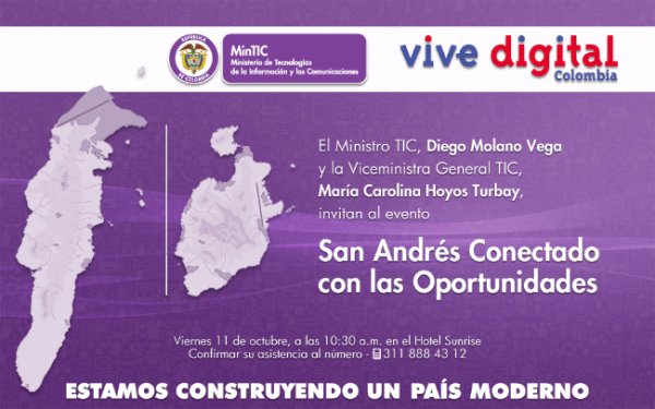 Este viernes 11 de octubre, el Ministro TIC, Diego Molano Vega y la Viceministra General TIC, María Carolina Hoyos, presentarán a la comunidad sanandresana los avances del Plan Vive Digital y el Proyecto Cable Submarino de Fibra.