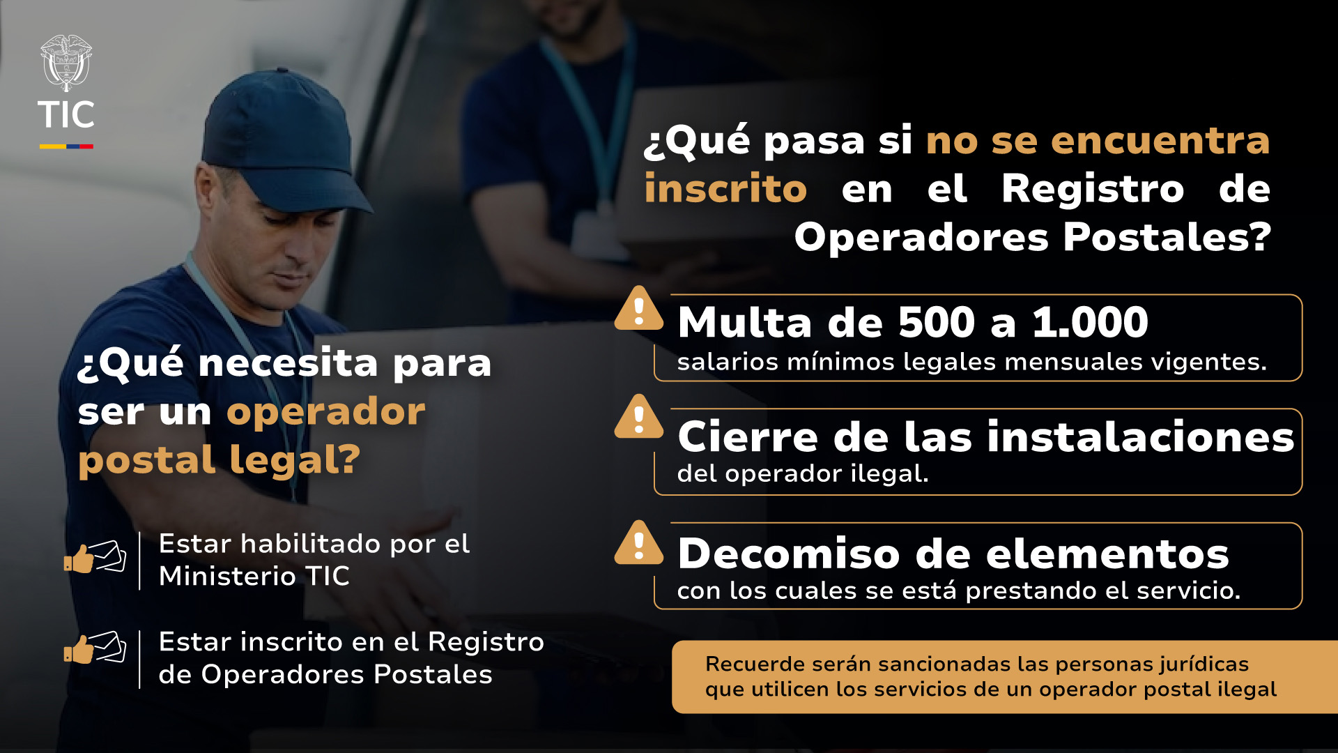 Para ser operador legal se requiere estar habilitado por el Ministerio de Tecnologías de la Información y las Comunicaciones y estar inscrito en el Registro de Operadores Postales.