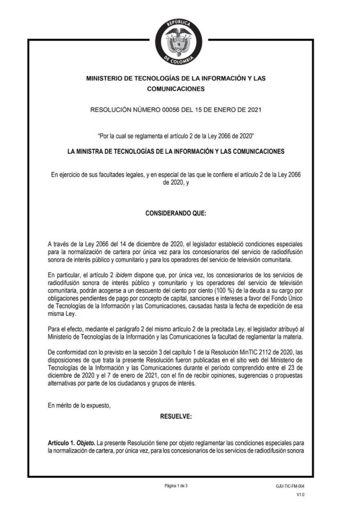 *Se trata de la Resolución 00056 del 15 de enero de 2021, que establece el mecanismo, requisitos y plazos para que estos medios que, por causa de la pandemia presentan saldos pendientes a favor del Fondo Único TIC, puedan tener por una sola vez el descuento del 100%.