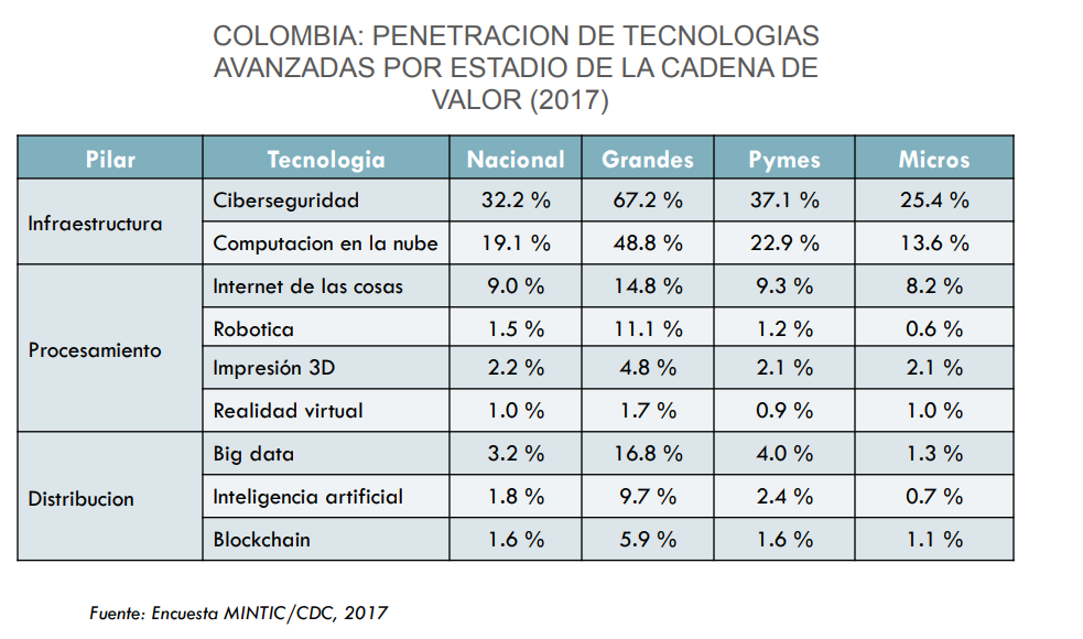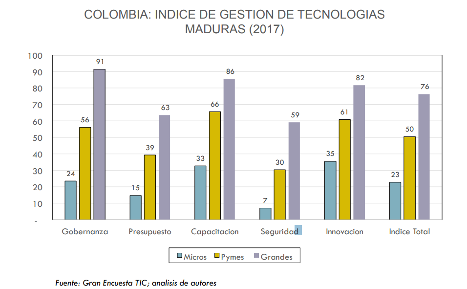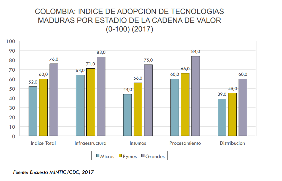 Colombia está comenzando a adoptar las tecnologías digitales avanzadas, y las grandes empresas son las que están liderando este proceso, con un Índice de Adopción de 20; seguido de las pymes con 10 y las microempresas con 7.