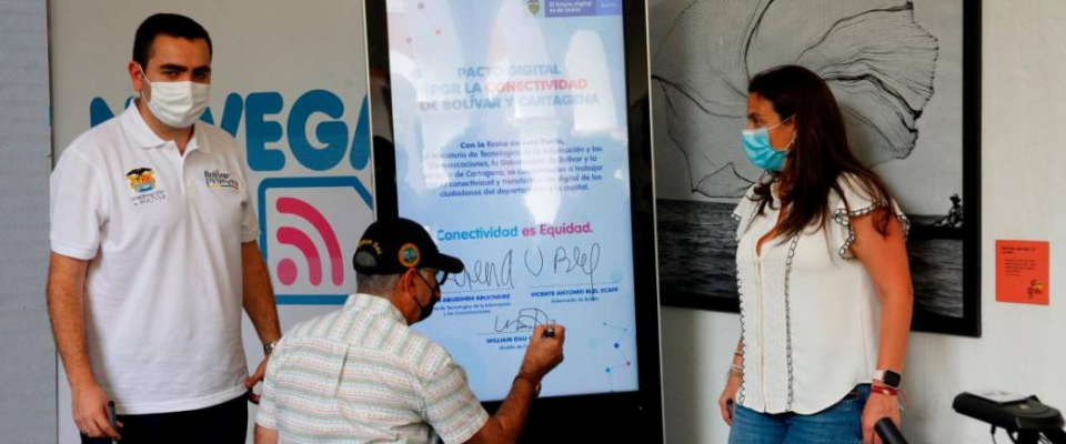 La semana pasada la ciudad fue escenario de un pacto por la conectividad para que Bolívar pase del 30% al 70% de conectividad, el cual firmaron el alcalde de Cartagena, William Dau Chamat; el gobernador de Bolívar, Vicente Blel Scaff; y la ministra TIC, Karen Abudinen Abuchaibe.
