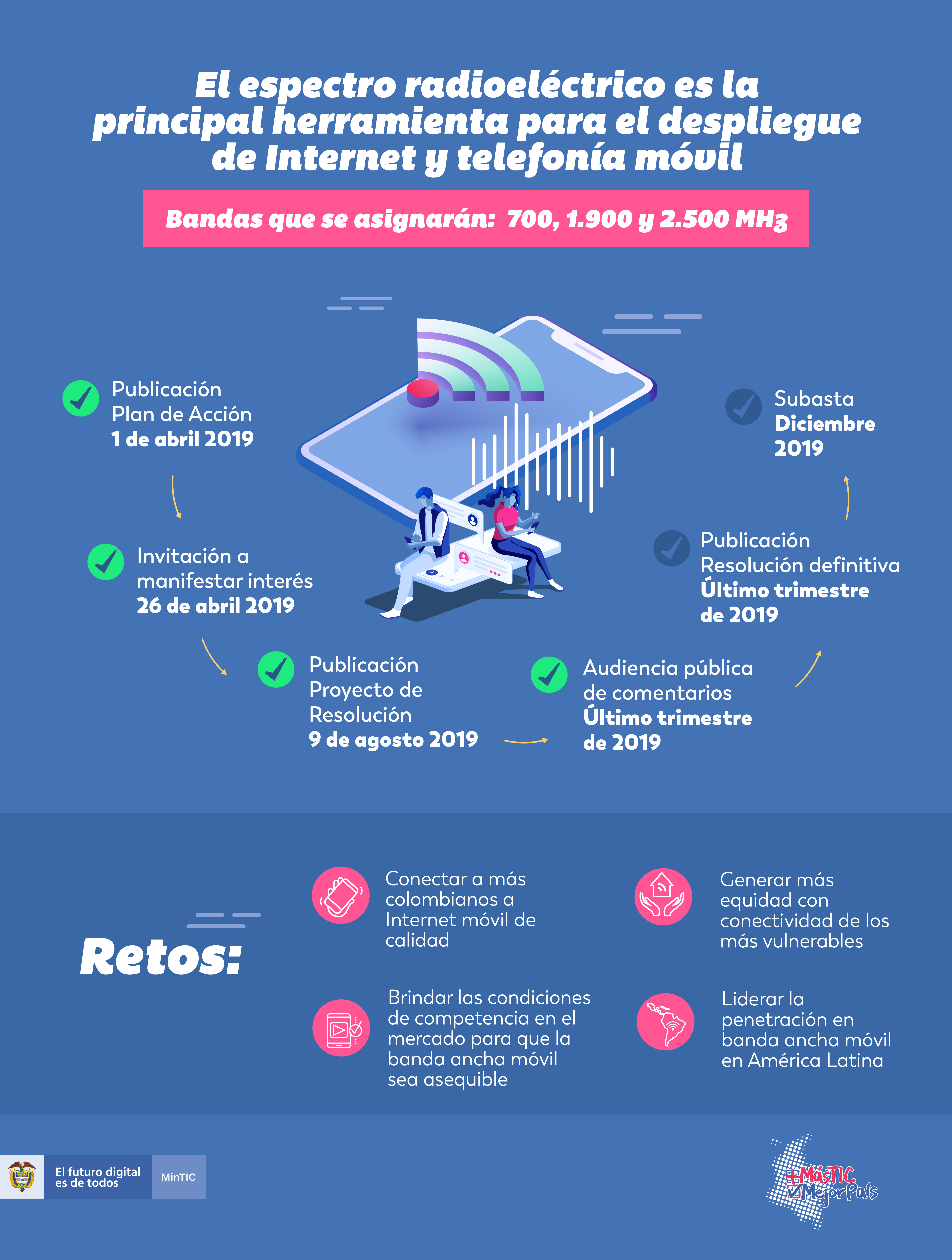 En un proceso que comenzó en el primer semestre del año, el Ministerio de Tecnologías de la Información y las Comunicaciones (MinTIC) avanza, según el cronograma establecido, en el proceso que culminará con la asignación de permisos para el uso del espectro radioeléctrico en las bandas de 700, 1.900 y 2.500 MHz. Esta asignación, permite a los proveedores de redes y servicios de telecomunicaciones que resulten asignatarios efectuar un despliegue eficiente de infraestructura y lograr una mayor cobertura.