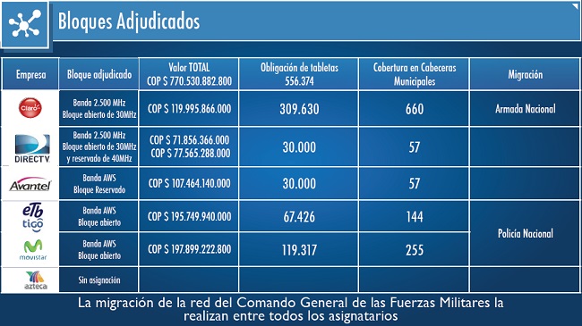 Additional to this sum of money the operators will have to devote resources to comply with obligations of coverage to the municipal seats further away, special plans and purchase of 556,374 tablets for the poorest students, as part of the payment by the spectre.