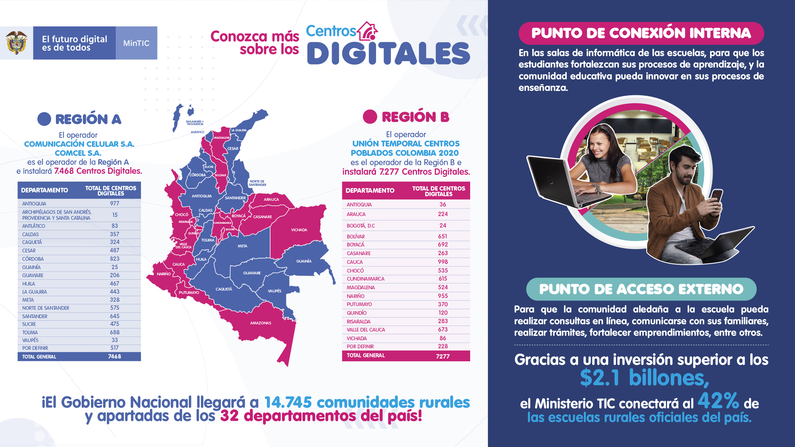 Los departamentos con mayor número de Centros Digitales serán Cauca (998); Antioquia (977); Nariño (955); Córdoba (823); Boyacá (692), Tolima (688), Valle del Cauca (673), Bolívar (651), Santander (645), Cundinamarca(615); Norte de Santander (575); Chocó (535); Magdalena (524); César (487); Sucre (475); Huila (467); y La Guajira (443). (Ver infografía adjunta)