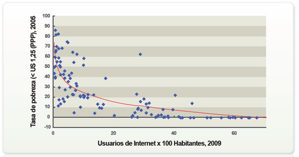 Distintos estudios han encontrado que existe una correlación directa entre la penetración y el uso de Internet, la apropiación de las TIC, la generación de empleo y la reducción de la pobreza. Por ejemplo, un estudio de las Naciones Unidas [UNCTAD2010] muestra como existe una clara correlación entre el número de usuarios de Internet y la tasa de pobreza de los países (Figura 1).