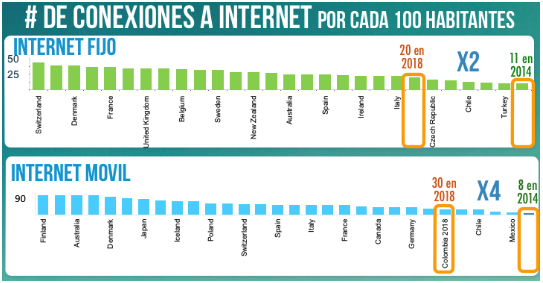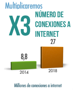 Gracias al Plan Vive Digital, durante el periodo 2010-2014 pasamos de 2.2 millones a 8.8 millones. de conexiones a Internet Durante los próximos cuatro años, y como resultado de las iniciativas del Plan Vive Digital 2014-2018, nos proponemos continuar con la expansión de la cobertura de Internet en el país, para llevarla a niveles asimilables a los de los países de la OECD. El objetivo es multiplicar por 3 el número de conexiones a Internet, llegando a 27 millones de conexiones en 2018. Con esto alcanzaremos niveles de acceso a Internet similares a los que hoy tienen Bélgica e Italia.