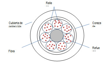 Está constituida por un núcleo y un revestimiento, ambos cilindros concéntricos y con diferente índice de refracción, siendo el del exterior inferior al del interior. Según el uso y las condiciones a las que será sometida, la fibra óptica además se cubre externamente con una capa llamada recubrimiento.